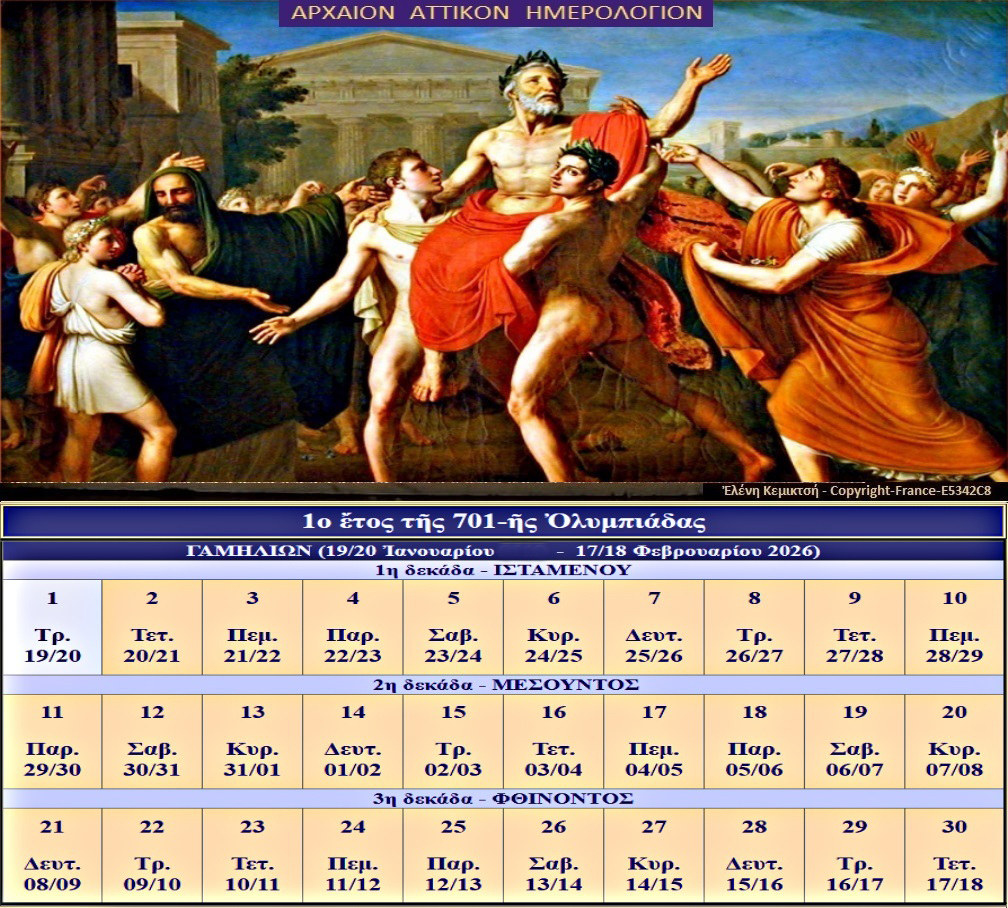 L'image changera au fil des mois - Cette année nous entrons dans la 1ème année de la 701ème Olympiade depuis les premiers Jeux Olympiques qui eurent lieu en 776 avant JC. Le septième mois de l'année Athénienne est Gamelion