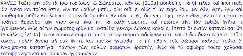 XXVIII. Peut-être, Socrate, suis-je parvenue à t'initier jusque-là aux mystères de l'Amour ; mais quant au dernier degré de l'initiation et aux révélations les plus secrètes, [210a] auxquelles tout ce que je viens de dire n'est qu'une préparation, je ne sais si, même bien dirigé, ton esprit pourrait s'élever jusqu'à elles. Je n'en continuerai pas moins, sans rien ralentir de mon zèle. Tâche de me suivre le mieux que tu pourras. Celui qui veut atteindre à ce but par la vraie voie doit, dès son jeune âge, commencer par rechercher les beaux corps. Il doit, en outre, s'il est bien dirigé, n'en aimer qu'un seul, et dans celui qu'il aura choisi engendrer de beaux discours. Ensuite, il doit arriver à comprendre que la beauté qui se trouve dans un corps quelconque [210b] est soeur de la beauté qui se trouve dans tous les autres. En effet, s'il faut rechercher la beauté en général, ce serait une grande folie de ne pas croire que la beauté qui réside dans tous les corps est une et identique. Une fois pénétré de cette pensée, notre homme doit se montrer l'amant de tous les beaux corps et dépouiller, comme une petitesse méprisable, toute passion qui se concentrerait sur un seul. Voir aussi la vidéo du Banquet de Platon mais aussi de l'Apologie de Socrate - Les dialogues de Platon (grec ancien) - Article de l'encyclopédie Ήλιος - Textes en ligne - Emission de Canal Académie sur le Timée de Platon