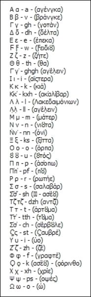 L'alphabet en tsakonien Prononciation des lettres dans le dialecte. Comme on peut voir le tsakonien a conservé le F (le digamma), le Q (koppa) lettres que l'on retrouve uniquement dans les formes les plus archaïques du grec.